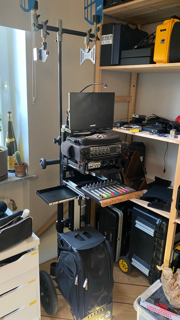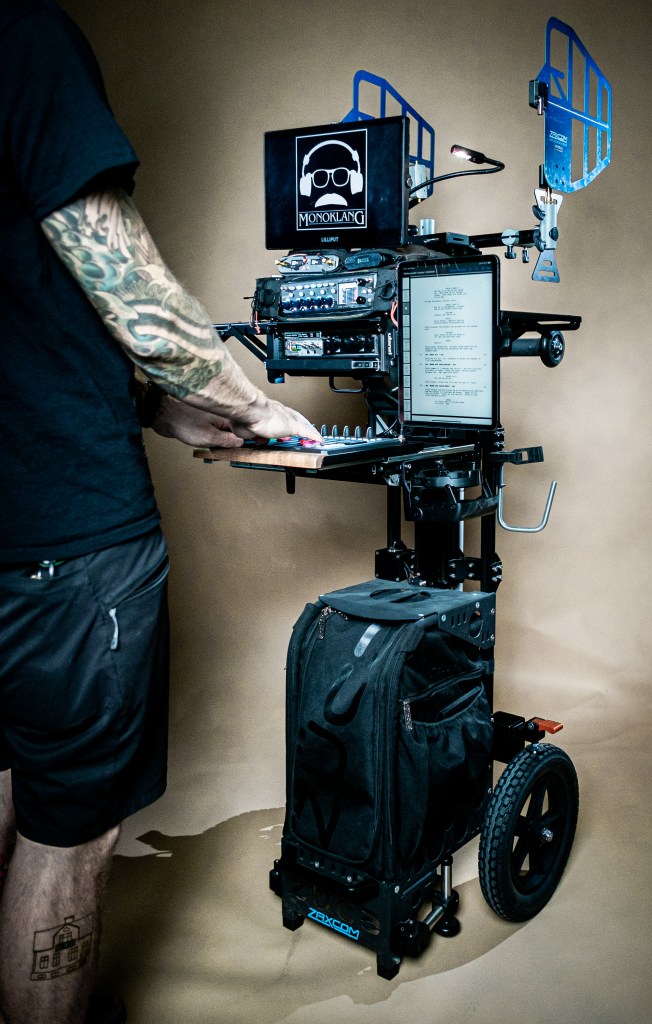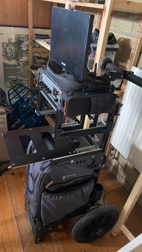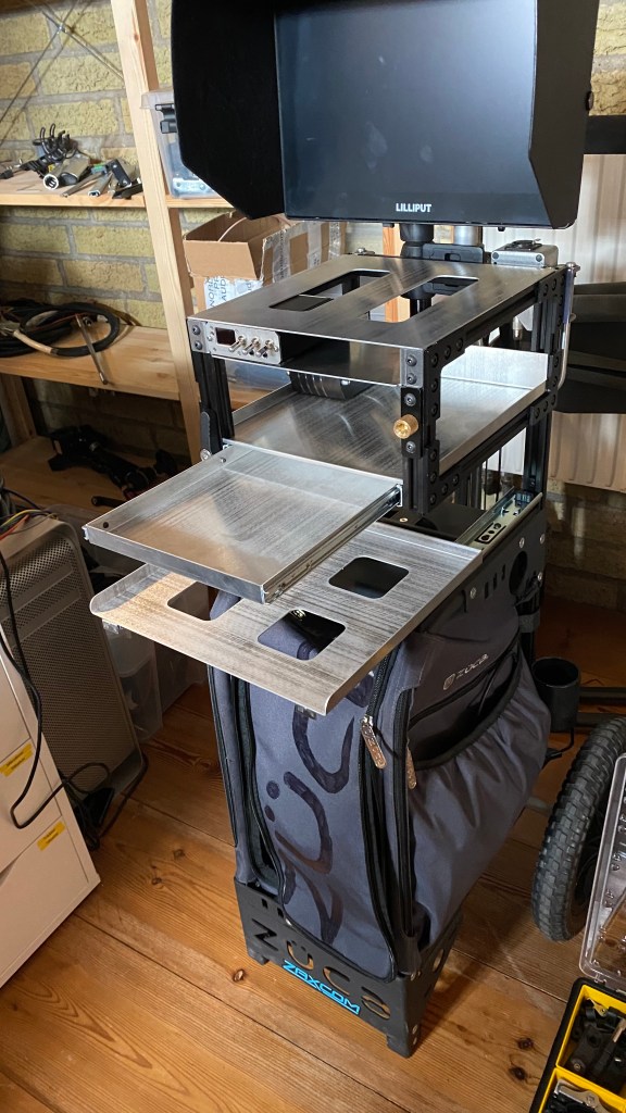 Till en början var tanken att bara ha nåt litet att sätta ljudväskan på. Men med inspiration från andra användare världen runt växte projektet till att försöka skapa en perfekt minimalistisk ljudvagn men utan kompromisser. Jag började klura på modifikationer och hur jag på bästa möjliga sätt skulle nyttja den lilla vagnen. Originalramen, som var gjord av ihåliga rör (20mm i diameter) byttes ut till v-slot 2020 aluminiumprofiler. I och med detta byte blev möjligheterna oändliga. Jag satte genast igång och testa några olika modeller. Samtidigt byttes original-handtaget ut mot en robustare variant av aluminiumrör och rörfästen. Elesa blev ett företag som jag hittade många delar hos. Många sömnlösa nätter har det blivit men resultatet är något jag är riktigt stolt över.